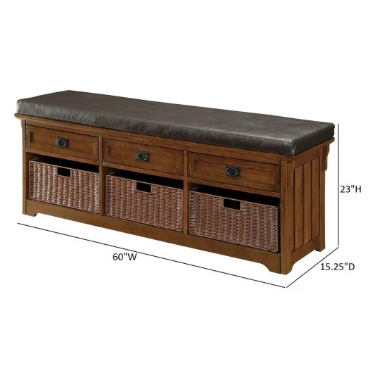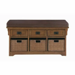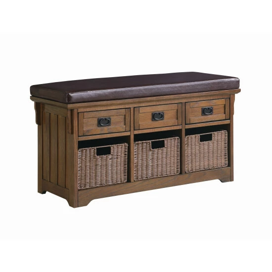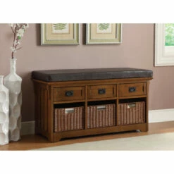Use this attractive Seminole oak bench from Copper Grove to provide your home with both a place to sit and a place to store items and keep things organized. This bench includes a comfortable pad on top, as well as three drawers and three baskets, perfect for shoes, scarves, and anything else you want to keep out of the way.