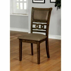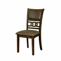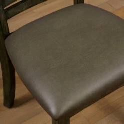 This handsomely designed dining chair is just the right balance between rustic and elegant. Padded grey leatherette elements mimic the luster of the satin finish on the chair’s wood frame. The backrest has an open ring cutout detail that adds just that special touch of craftsmanship to this chair.