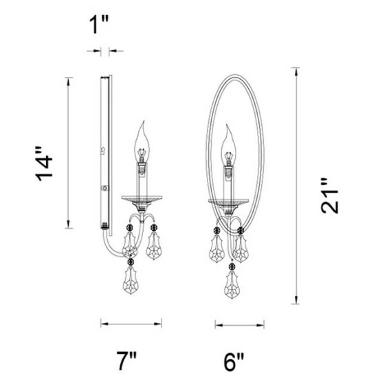This 6 inch, single light wall sconce is from our collection. With a traditional look in the frame design, Oxidized Bronze color and crystal shape/ placement, this piece is surely a timeless treasure that will give character and antiquity to your interior design. – Dimensions: H 21 inches x W 6 inches x D 6 inches – Oxidized Bronze Finish – Requires 1 E12 Bulbs Max 60 W (sold separately) – Contemporary Style