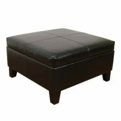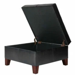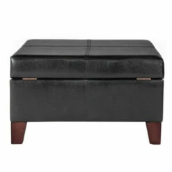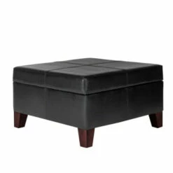 This large faux leather storage ottoman offers an easy and stylish storage solution for pillows, blankets, books or toys. The classic black leather like upholstery on this square ottoman makes it suitable as a coffee table ottoman in a living room or family room, or as extra seating in a study. The hinged lid allows quick access to items nearby but out of view. With stitching details for added interest and tapered wood legs in a redwood finish, this large storage ottoman will be a welcome addition to any home. Easy to assemble and maintain.