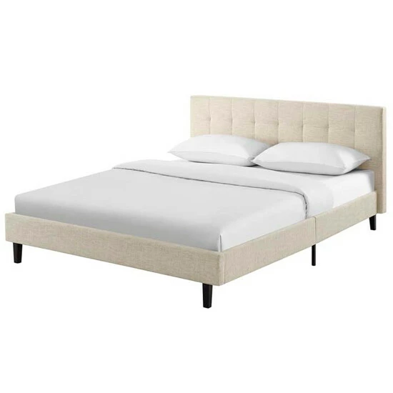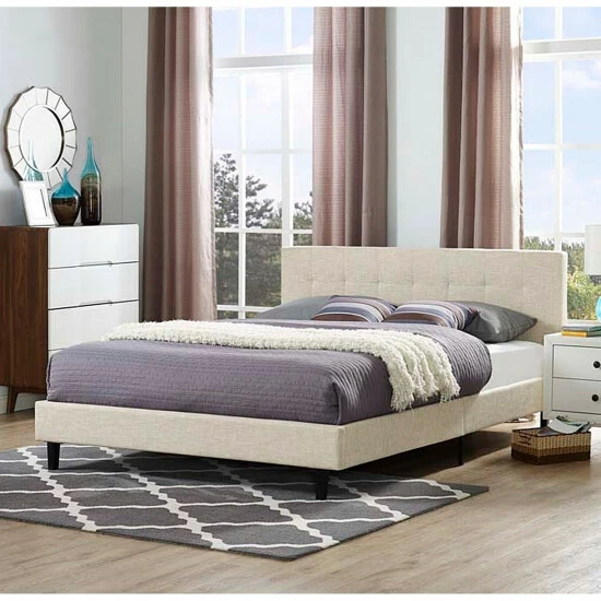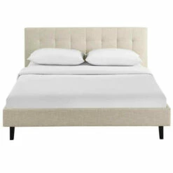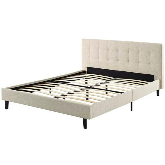 Refine your bedroom with the simple yet elegant Full-size beige fabric platform bed with tufted headboard featuring a wood frame upholstered with beige fabric and wood slats that are designed to support your mattress without the use of a box spring. The frame also includes metal legs in the center for additional support. The headboard features beige fabric tufted upholstery that adds an extra element of style and serves as a comfortable and functional addition to the bed by providing a soft surface to lean against while reading or watching television in bed and remaining attractive during the day. Platform beds are designed to give your room an open concept feel and are perfect for those who don’t like high seated beds. Perfect for contemporary and modern bedrooms, sleep soundly with a piece that imparts a sense of tranquility amidst an impressive backdrop of style. Add some style to your bedroom with this attractive platform bed.