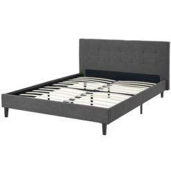 Refine your bedroom with the simple yet elegant platform bed with tufted headboard featuring a wood frame upholstered with grey fabric and wood slats that are designed to support your mattress without the use of a box spring. The frame also includes metal legs in the center for additional support. The headboard features grey fabric tufted upholstery that adds an extra element of style and serves as a comfortable and functional addition.