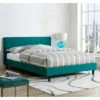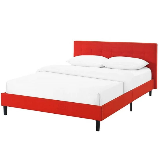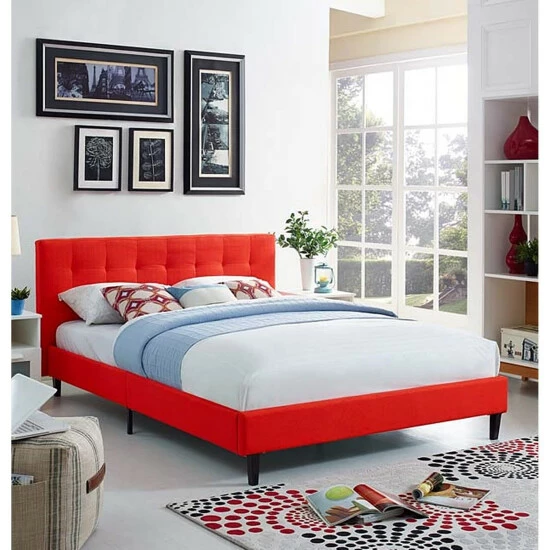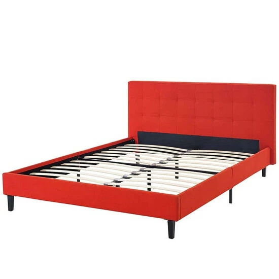 Refine your bedroom with the simple yet elegant Full-size red fabric platform bed with tufted headboard featuring a wood frame upholstered with atomic red fabric and wood slats that are designed to support your mattress without the use of a box spring. The frame also includes metal legs in the center for additional support. The headboard features atomic red fabric tufted upholstery that adds an extra element of style and serves as a comfortable and functional addition.