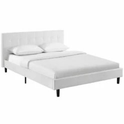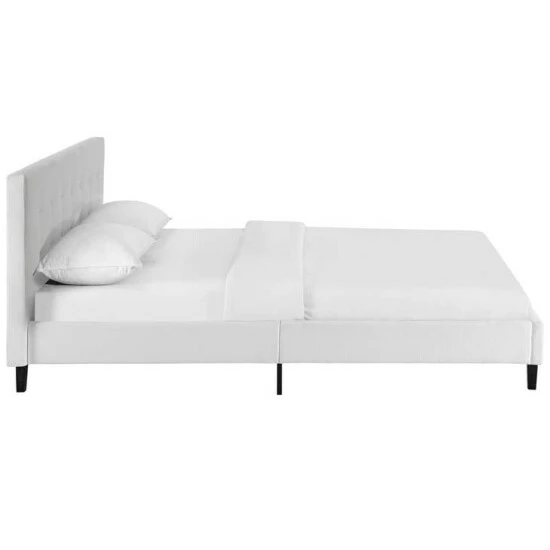 Refine your bedroom with the simple yet elegant Full-size white fabric platform bed with tufted headboard featuring a wood frame upholstered with white fabric and wood slats that are designed to support your mattress without the use of a box spring. The frame also includes metal legs in the center for additional support. The headboard features white fabric tufted upholstery that adds an extra element of style and serves as a comfortable and functional addition.