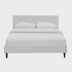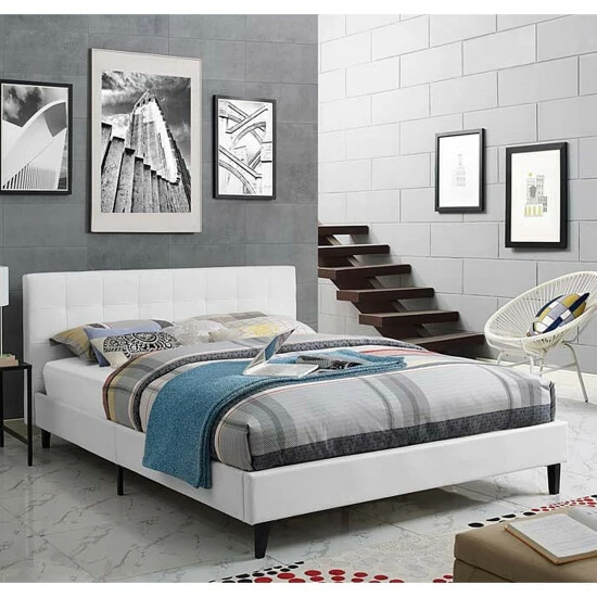 Refine your bedroom with the simple yet elegant Full-size white leather platform bed with tufted headboard featuring a wood frame upholstered with white faux leather and wood slats that are designed to support your mattress without the use of a box spring. The frame also includes metal legs in the center for additional support. The headboard features white faux leather tufted upholstery that adds an extra element of style and serves as a comfortable and functional addition.