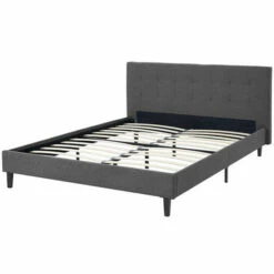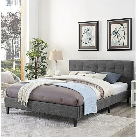 Refine your bedroom with the simple yet elegant Queen size grey fabric platform bed with tufted headboard featuring a wood frame upholstered with grey fabric and wood slats that are designed to support your mattress without the use of a box spring. The frame also includes metal legs in the center for additional support. The headboard features grey fabric tufted upholstery that adds an extra element of style and serves as a comfortable and functional addition.