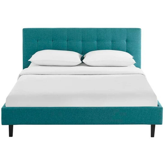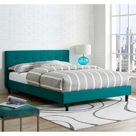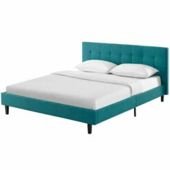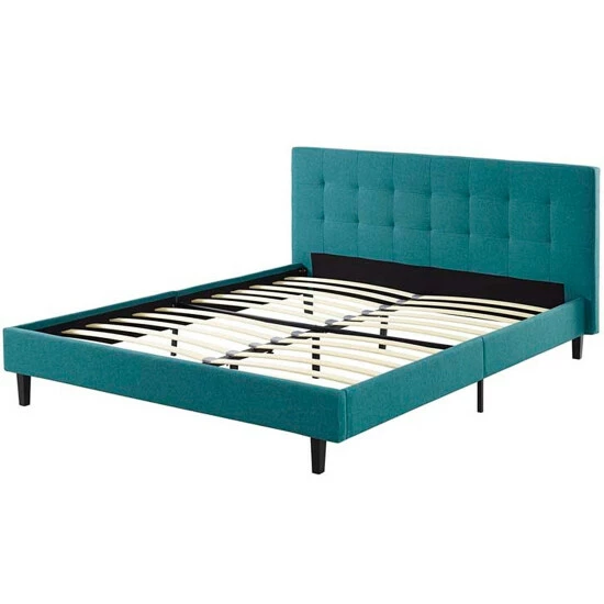 Refine your bedroom with the simple yet elegant Queen size teal fabric platform bed with tufted headboard featuring a wood frame upholstered with teal fabric and wood slats that are designed to support your mattress without the use of a box spring. The frame also includes metal legs in the center for additional support. The headboard features teal fabric tufted upholstery that adds an extra element of style and serves as a comfortable and functional addition.