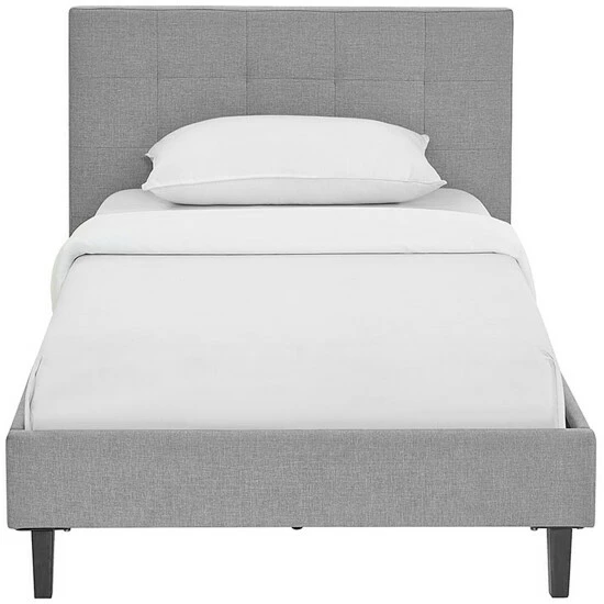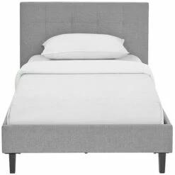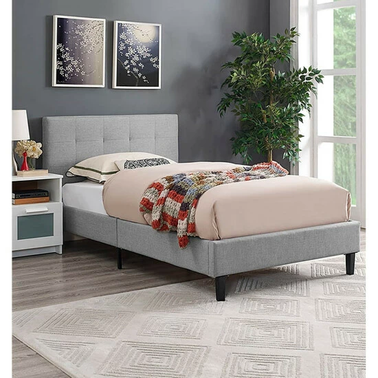 Refine your bedroom with the simple yet elegant Twin Size Light Grey Fabric Platform Bed with Tufted Headboard featuring a wood frame upholstered with light grey fabric and wood slats that are designed to support your mattress without the use of a box spring. The frame also includes metal legs in the center for additional support. The headboard features light grey fabric tufted upholstery that adds an extra element of style and serves as a comfortable and functional addition to the bed by providing a soft surface to lean against while reading or watching television in bed and remaining attractive during the day. Platform beds are designed to give your room an open concept feel and are perfect for those who don’t like high seated beds. Perfect for contemporary and modern bedrooms, sleep soundly with a piece that imparts a sense of tranquility amidst an impressive backdrop of style. Add some style to your bedroom with this attractive platform bed.
