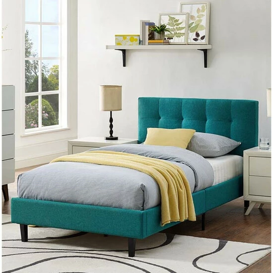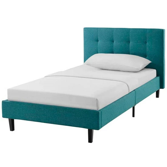 Refine your bedroom with the simple yet elegant Twin Size Teal Fabric Platform Bed with Tufted Headboard featuring a wood frame upholstered with teal fabric and wood slats that are designed to support your mattress without the use of a box spring. The frame also includes metal legs in the center for additional support. The headboard features teal fabric tufted upholstery that adds an extra element of style and serves as a comfortable and functional addition to the bed by providing a soft surface to lean against while reading or watching television in bed and remaining attractive during the day. Platform beds are designed to give your room an open concept feel and are perfect for those who don’t like high seated beds. Perfect for contemporary and modern bedrooms, sleep soundly with a piece that imparts a sense of tranquility amidst an impressive backdrop of style. Add some style to your bedroom with this attractive platform bed.