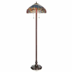 Individually crafted pieces of glass are completely wrapped in fine copper foil to create a work of art that is as functional as it is beautiful. The heavy cast zinc-alloy base with a bronze-tone finish keeps the lamp from tipping over, while two pull chains make it easy to switch off before going to bed.