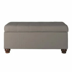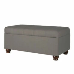 This classically designed tufted storage bench provides a variety of home decor options. Use it as a coffee table ottoman in a living room to serve guests. Position it in a family room to relax feet on after a long day. Place it as an end of bed bench to hold pillows and blankets. With straight wood legs in a light cherry finish, neutral gray fabric, deep button tufting and a hinged lid for easy access, this storage bench is a premium addition for any home. Easy to assemble and maintain.