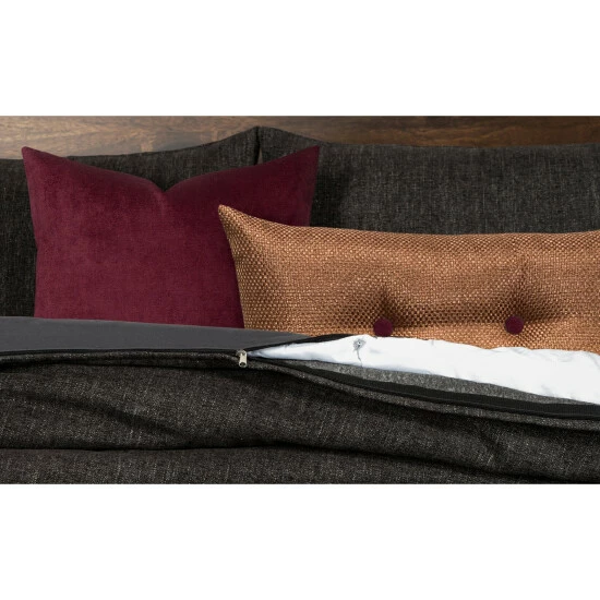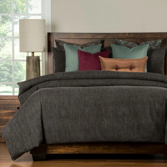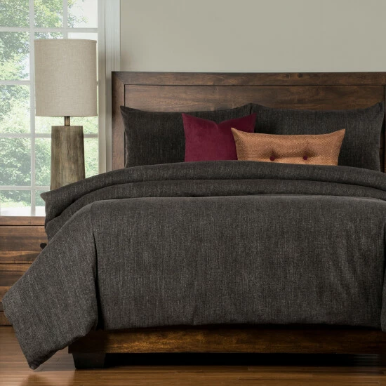 Decorate your bedroom with this 6-piece duvet cover set. This set features a charcoal grey color and is available in five different sizes. The duvet cover and matching shams secure with zipper closures for easy cleaning. The set comes with one duvet cover, one comforter, two shams, one throw pillow, and one buttoned throw pillow.