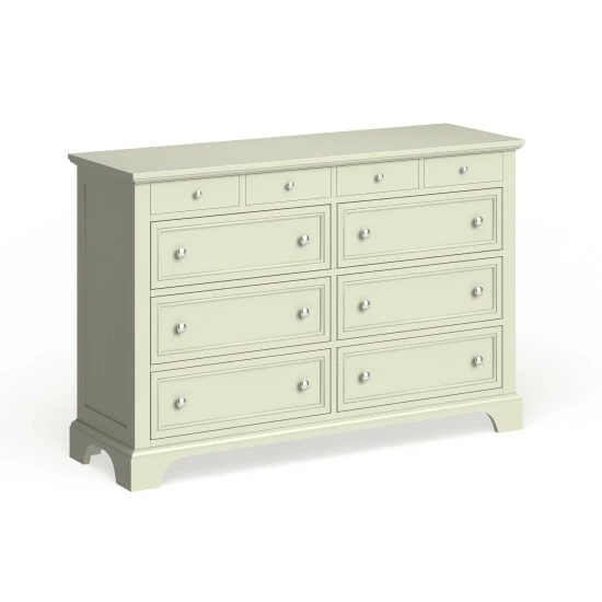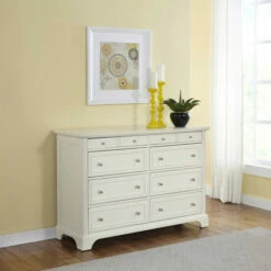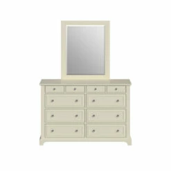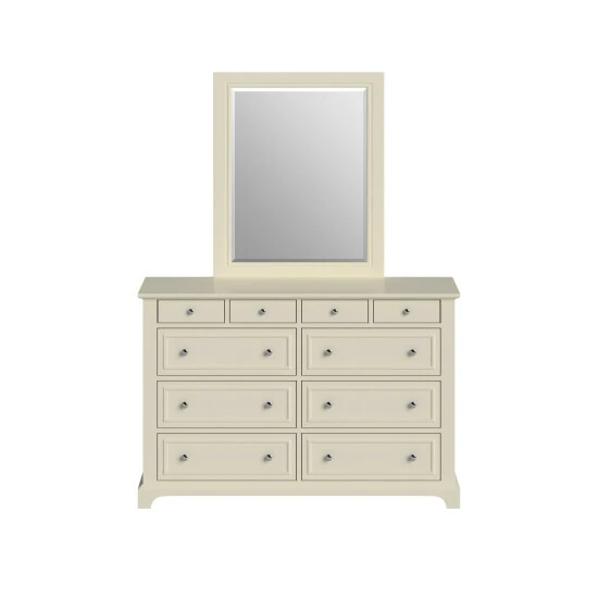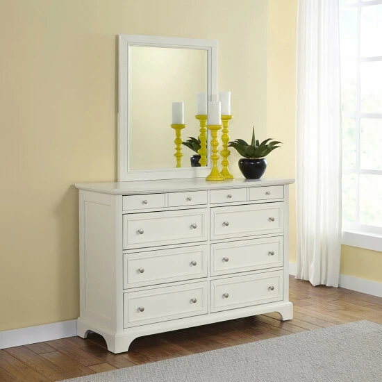 Enjoy elegant style and spacious storage with this dresser. Available with an optional mirror, the dresser features eight drawers. The top two drawers have felt-lined bottoms, ideal for jewelry and other fragile items, while the six larger drawers are perfect for clothes. The smooth white finish, slightly flared legs, and raised panels complement any decor with lovely elegance.