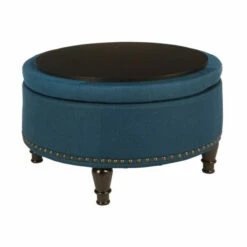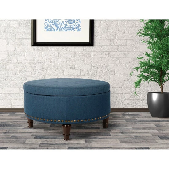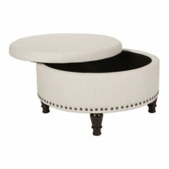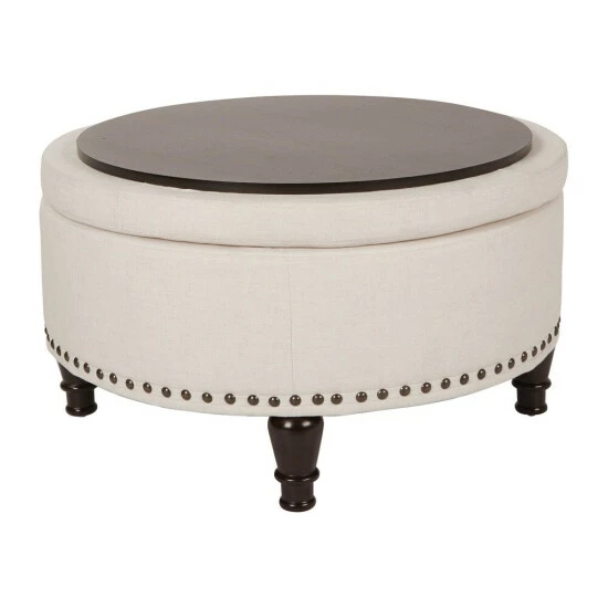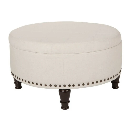 Durably constructed with easy care fabric, this circular ottoman will withstand the test of time while still retaining its distinguished demeanor. Designed with attention to detail, this classic and timeless furnishing features brass color nail head trim and deep espresso stained turned legs.