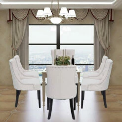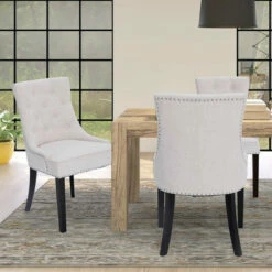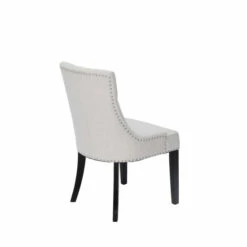 This glamorously minimalist and stylish two-piece dining chair set is a perfect addition to any dining room. The set of two chairs consists of a wooden frame and beige cloth, along with a foam-filled cushioned seating area for the ultimate comfort and style regarding your seating scenario.