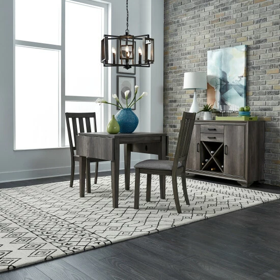 Be distinctively different with the Tanners Creek three-piece drop leaf set. Crafted of a rubberwood solid frame and scratch resistant melamine, this set features a Greystone finish and consists of the drop leaf table and two slat back side chairs. The drop leaf table features two 9″ drop down leaves and is anchored by tapered legs. The slat back side chairs offer a padded upholstered seat in a grey tweed fabric and have tapered legs with nylon chair glides to protect your flooring. Clean lines and small scale create the perfect balance for condos and lofts.