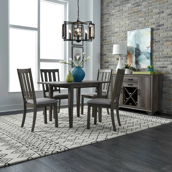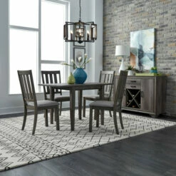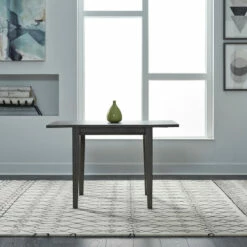 Be distinctively different with the Tanners Creek five-piece drop leaf set. Crafted of a rubberwood solid frame and scratch resistant melamine, this set features a Greystone finish and consists of the drop leaf table and four slat back side chairs. The drop leaf table features two 9″ drop down leaves and is anchored by tapered legs. The slat back side chairs offer a padded upholstered seat in a grey tweed fabric and have tapered legs with nylon chair glides to protect your flooring. Clean lines and small scale create the perfect balance for condos and lofts.