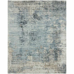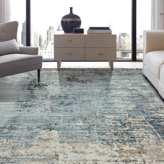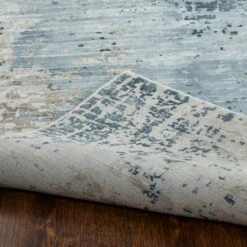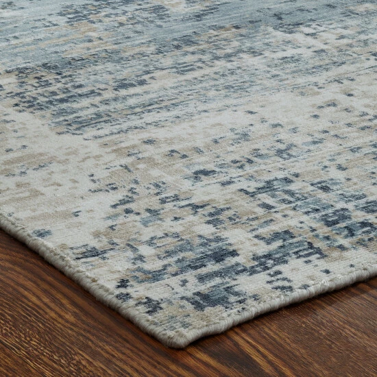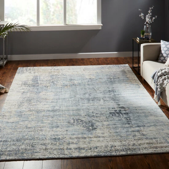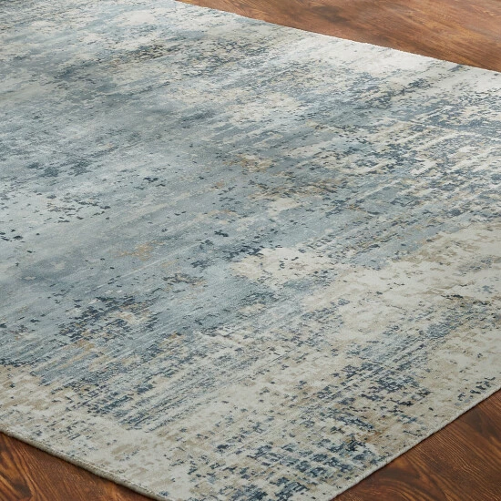 - Features a modern abstract pattern with tones of blue, gold and ivory