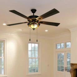 - ENERGY EFFICIENT: Five reversible blades (Rich Barnwood and Light Driftwood) allow for maximum air flow and comfort. Pull chain can be used to control the light strength and blade speed. Three speed (reversible) motor. Blade pitch of 12.5 degrees.
