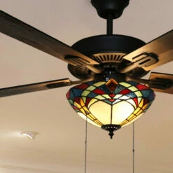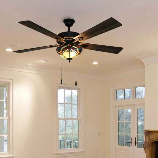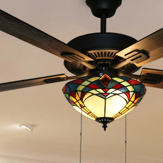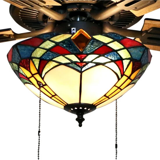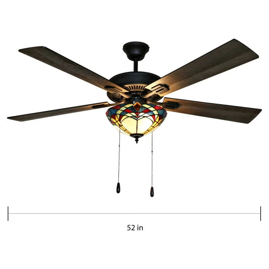 - TIFFANY STYLE LIGHTING DESIGN: A traditional Tiffany Style 3-light ceiling fan crafted with hand-cut pieces of stained glass; temperature efficient ceiling fan with reversible (Rich Barnwood and Light Driftwood) fan blade options.