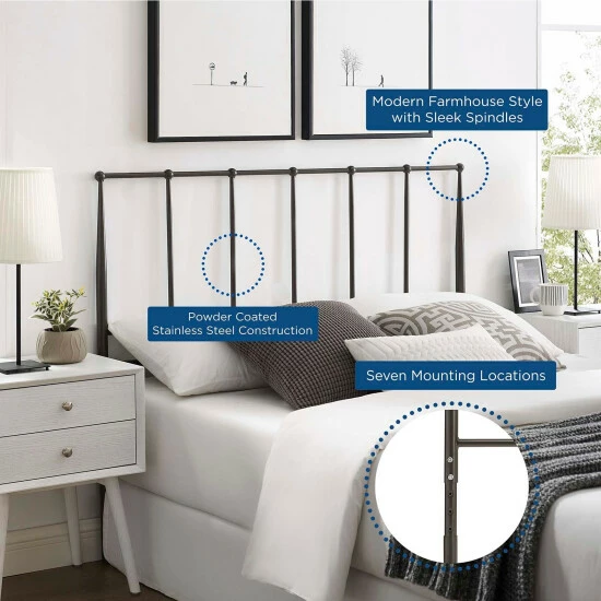 Add a touch of nostalgia with the cottage style of the King Metal Headboard. A perfect complement to industrial, rustic, and farmhouse decor themes, adds relaxing vintage appeal in the master suite or guest bedroom with a quality frame made of stainless steel. This charming metal headboard for twin bed frames comes with non-marking foot caps to help protect flooring and a design reminiscent of traditional country homes. Gracefully designed with integrated round finials, the is height adjustable from 39 inches to 48.8 inches.
