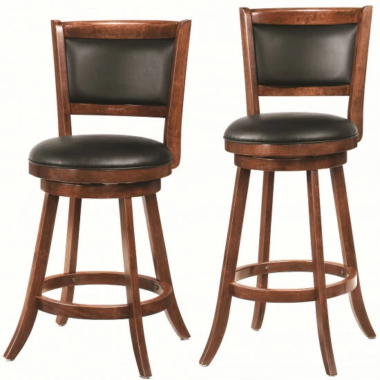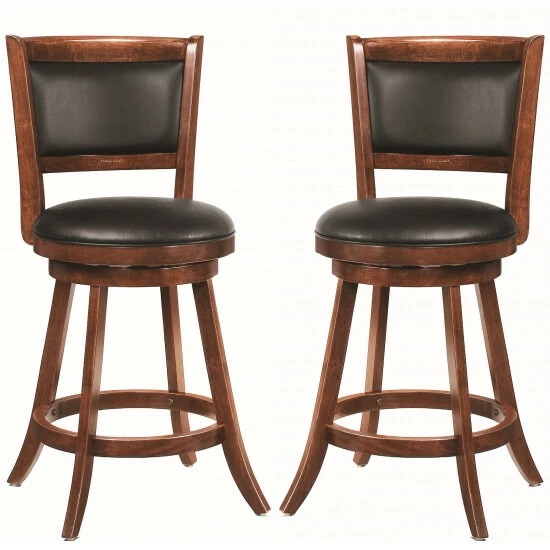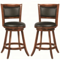 Add functional and homey seating in your kitchen bar or gathering area in your home. Choose between 24′ counter height seat, or 29′ bar height seat. These stools feature a swivel capability with a gorgeous chestnut finish, a support and foot rest ring, and a black leatherette upholstered seat and back. Create sophisticated and beautiful seating options for your home with this swivel bar stools. These stools have enough character to warm up your room and will effortlessly become the eye catching focal point of your dining area.
