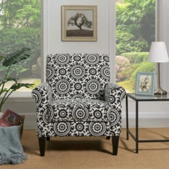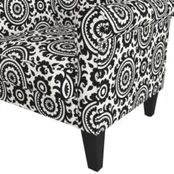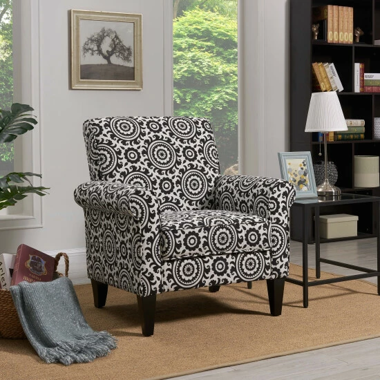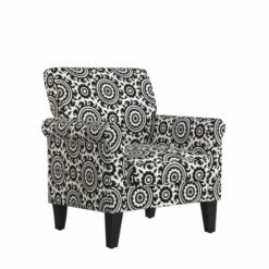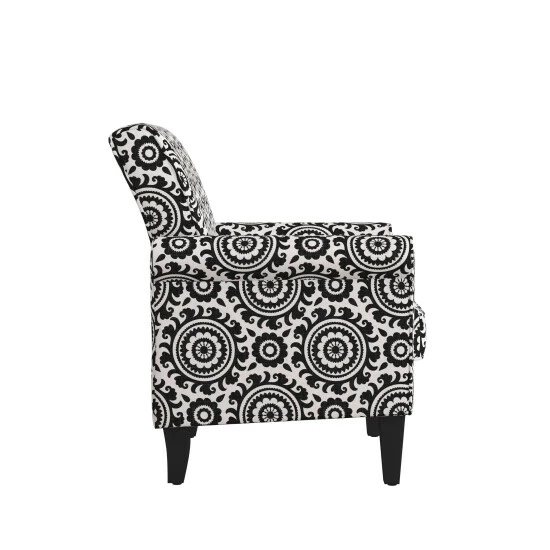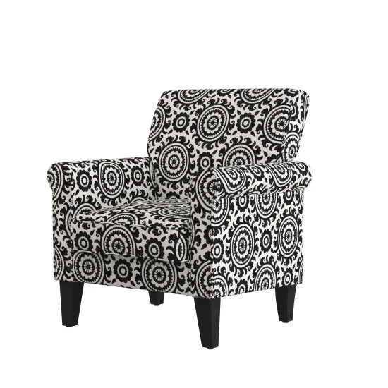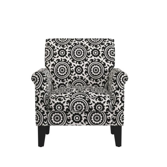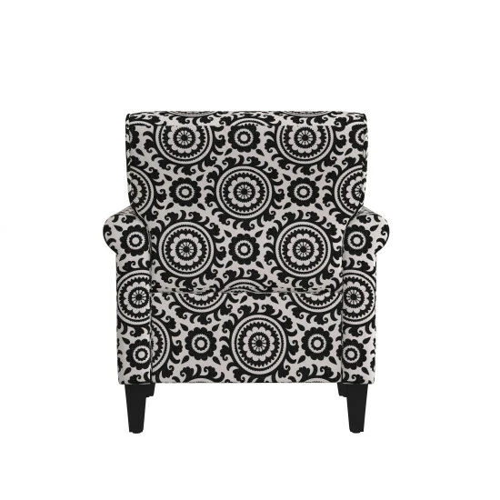 Enliven your home with this classically shaped arm chair from Copper Grove. Covered in a contemporary, black and cream medallion fabric, this armchair offers an updated take on tradition. Comfortable and stylish, the chair features a tight square back and rolled arms. The lively black and white print will match almost any decor while remaining neutral in color.