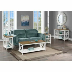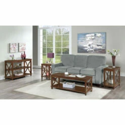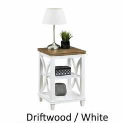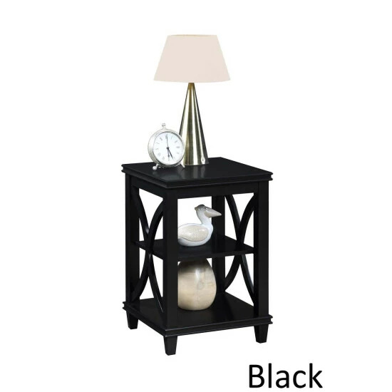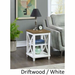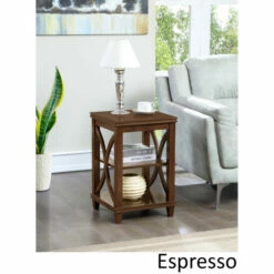 Enhance your living space with the elegance of the Copper Grove Valencia End Table . Thoughtfully developed and designed, this versatile end table provides both stability and style. The soft X-shaped side design of this piece will stunningly accent any furniture collection. This sleek transitional table includes two shelves for displaying decor. Constructed of durable rubberwood and finished with an oak veneer, enhanced with your choice of multiple finishes.