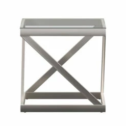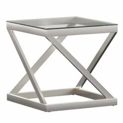 Bring sophistication to your living area with this Copper Grove end table. Crafted in a sleek design, the table is created using clear glass for elegance and features a brushed nickel X-cross base for added glamour. The metal construction gives the table extra durability and stability.