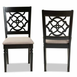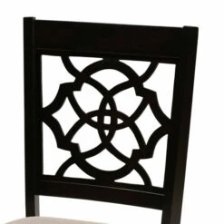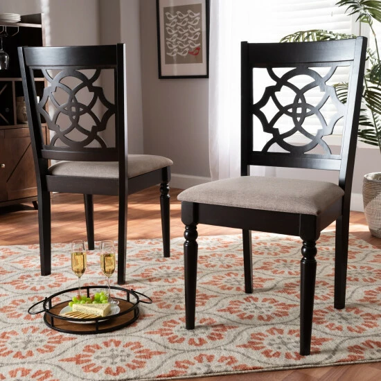 Elegant design marries quality craftsmanship in the dining chair. the is constructed from solid oak wood and showcases a rich espresso brown finish that complements the light polyester fabric upholstery. Designed with both comfort and style in mind, the features a plush foam-padded seat, as well as an exquisite cut-out design on its back. The dining chair comes in a pack of two and requires assembly. Ring-turned legs add a classic, refined touch.