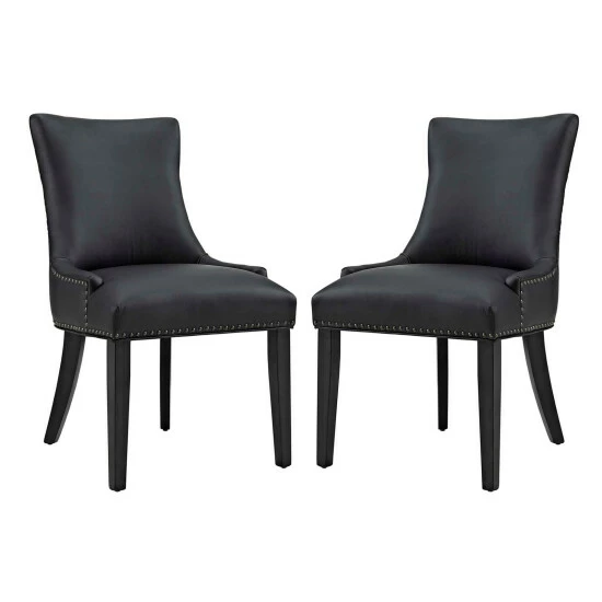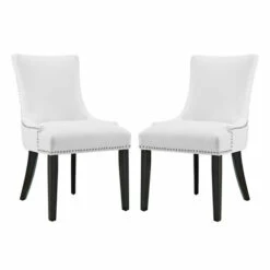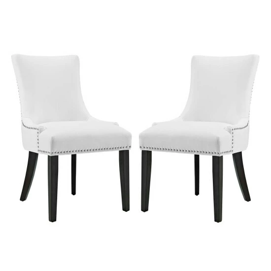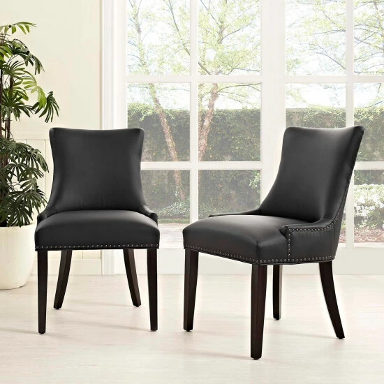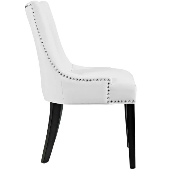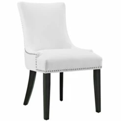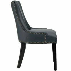 Bequeath distinction with this dining chair. Charm and elegance adorn this luxurious button tufted dining chair complete with sleek curves and antique copper nailhead trim. Featuring dense foam padding, fine vinyl upholstery, solid wood frame, and non-marking foot glides, this is an elegant dining chair perfect for the modern home.