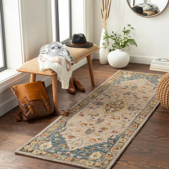 Hand-tufted wholly of wool for long-lasting enjoyment, this rug combines classic elegance with a versatile blue-and-beige color palette for beauty and style. This rug is available in multiple shapes and sizes to fit easily into your existing decor. Complete your traditional or eclectic decor with this stunning medallion area rug.