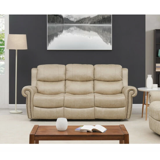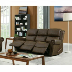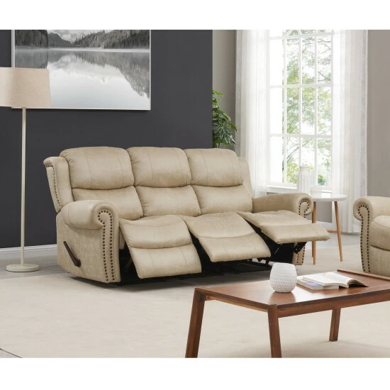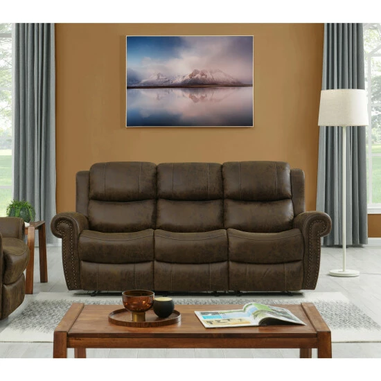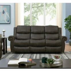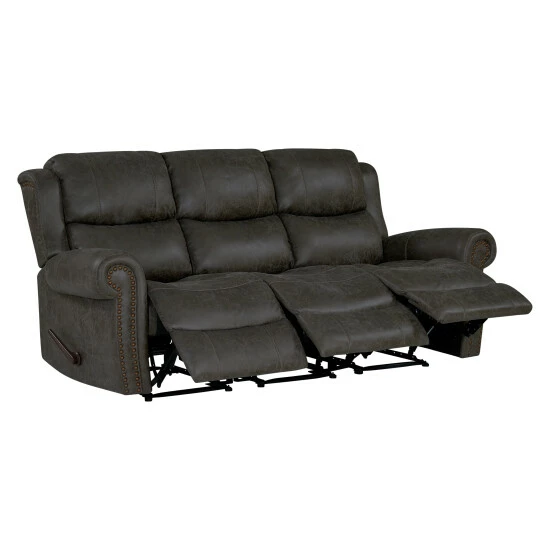 Take home robust and fashionable relaxation in the form of this three-piece rolled arms with bronze nailhead trim and stitched tufted back. Upholstered with a distressed faux leather. Showcasing left- and right-arm reclining arm seats and an armless center reclining seat, this set has a button-and-slot connection that connects them all together in linear harmony.