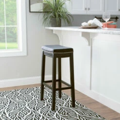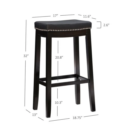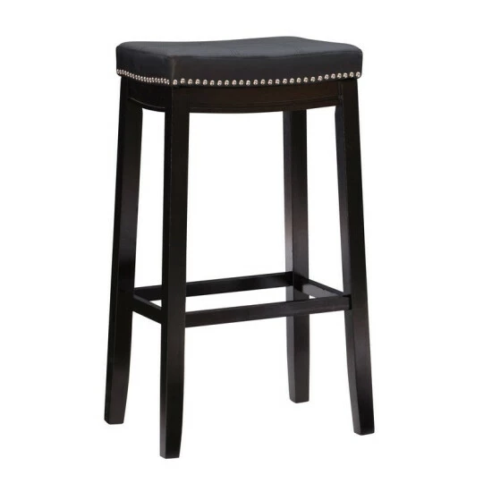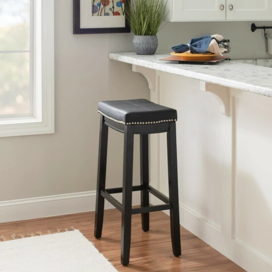 This Black Bar Stool will add stylish seating to any counter or high-top table in your home. The sturdy wood frame has a black finish accented by a black faux leather seat. Silver nailhead trim and double-needle accent stitching add durability to the padded top for an eye-catching detail with an easy-to-clean material.