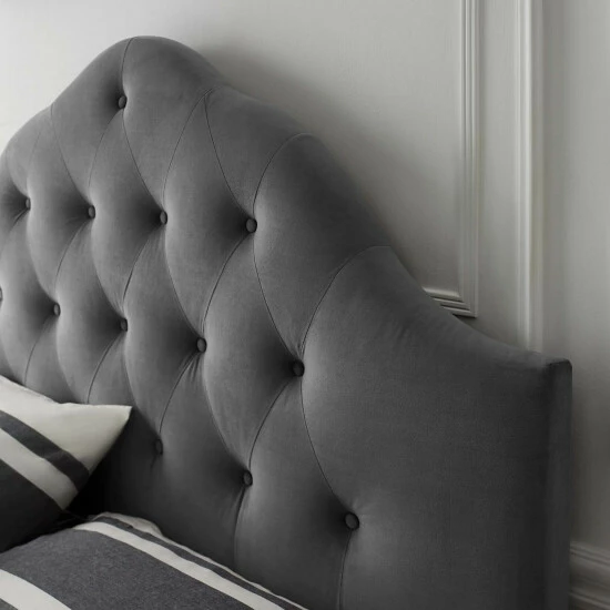 Regal curves and a slightly curved silhouette blend with plush vintage glamour to create this velvet Queen Headboard. A delightful focal point for any master suite or guest room, this upholstered velvet headboard for queen bed frames provides a soft, stain-resistant update for luxurious comfort while relaxing, reading, or conversing in bed. Solidly constructed from plywood and fiberboard with dense foam padding, this diamond tufted queen size velvet headboard comes with five mounting positions that are height adjustable from 45″ – 52.5″.