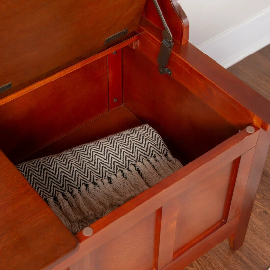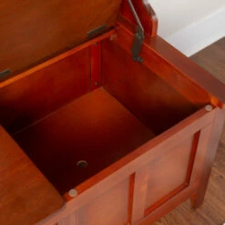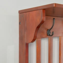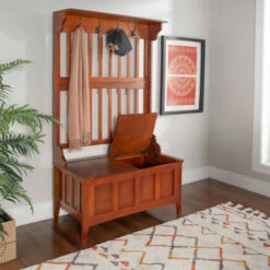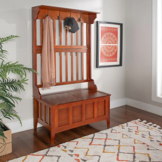 Keep your mud room or entryway neat and tidy with this beautiful and unique hall tree storage bench. This storage bench features an attractive rich walnut finish and will provide function and style to any room in your home. The bench features a split seat, allowing the user to rest on one side of the bench, while retrieving articles from the storage compartment on the opposite side. A back panel with four hooks is perfect for hats and coats.