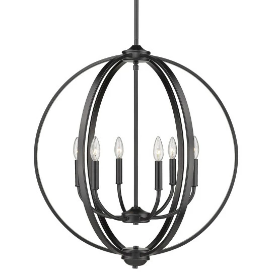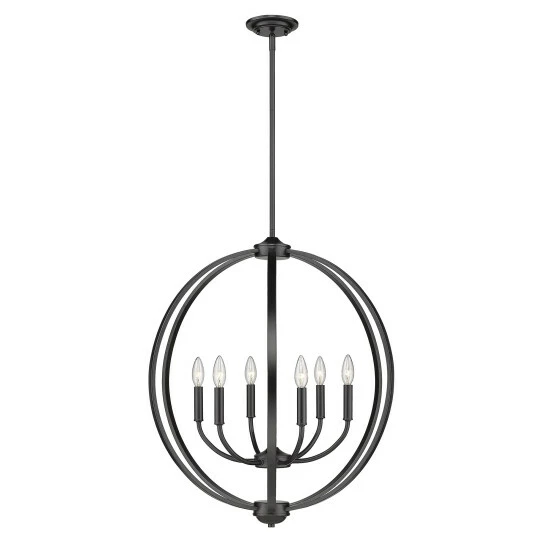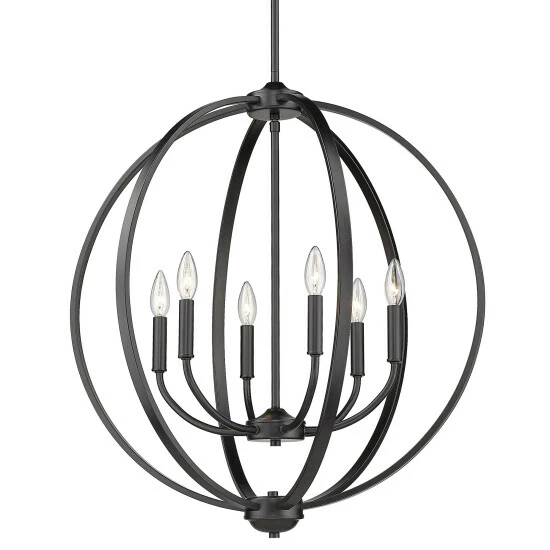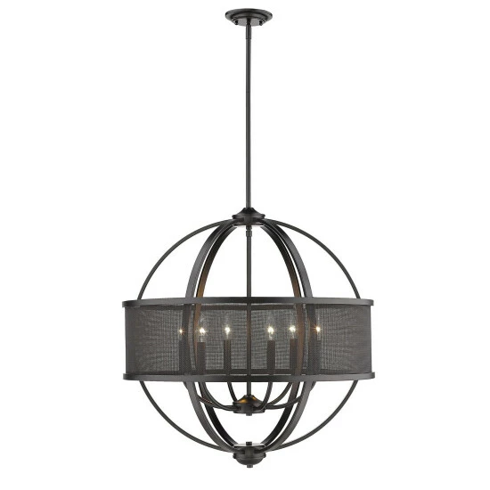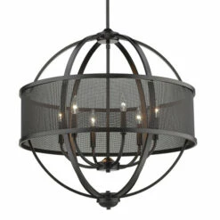 This striking six-light chandelier has it all; its curvaceous arms sit inside simple round frames, for a modern geometric style you’re sure to favor. You can order this piece with or without metal mesh shades, which shield the otherwise exposed bulbs, for a bit of vintage refinement.