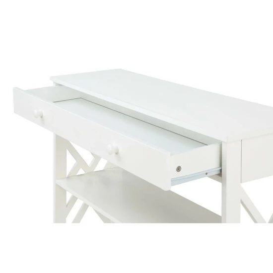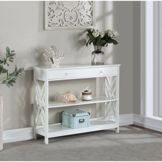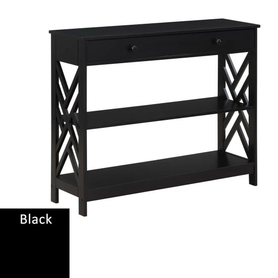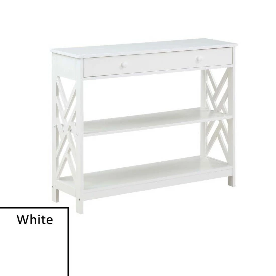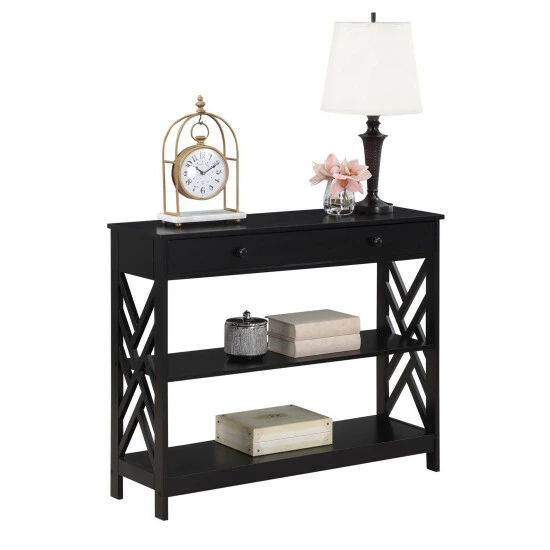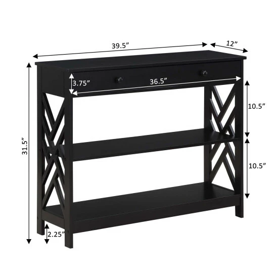 Style your home with the geometric design of the Copper Grove Zeus Console Table with Shelf. This transitional table features a pull-out drawer on smooth roller slides and includes two stylish drawer knobs for easy accessibility. This spacious drawer offers plenty of room to stow away entertainment essentials and everyday necessities. The unique dimensional side panels and the three tiers of shelving make this console the perfect decorative piece to display in any room of your home. Carefully crafted from MDF, non-lead-based paint, and particleboard, this unit was made for long-term use.
