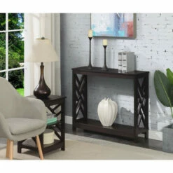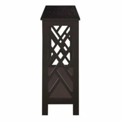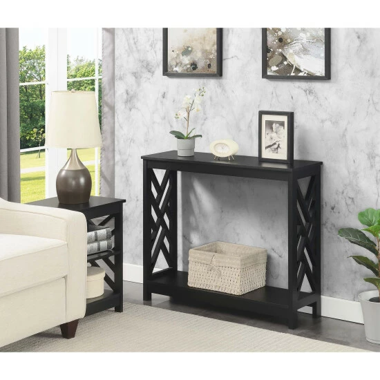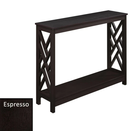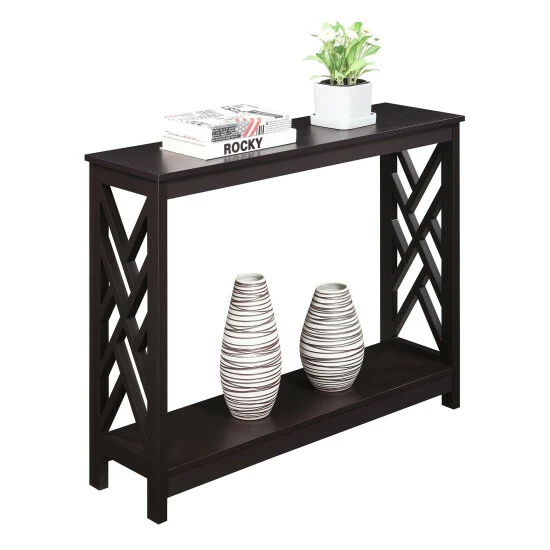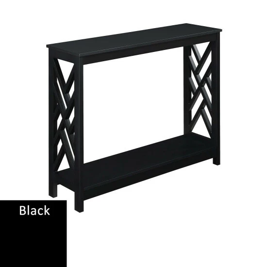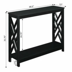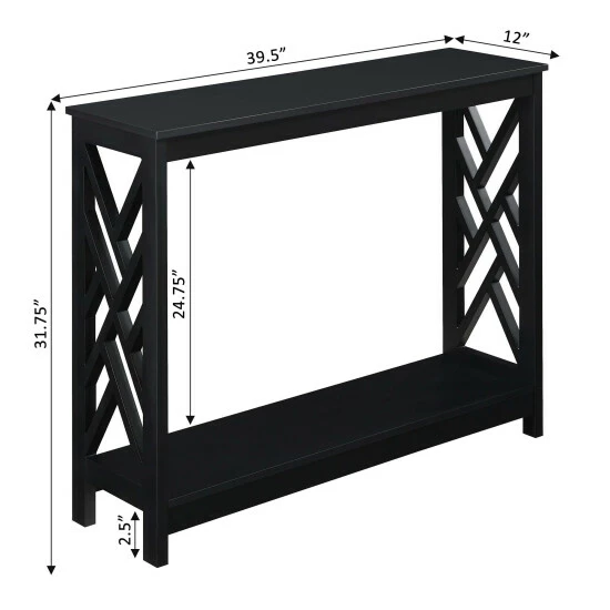 Renew your favorite living space with the transitional style of the Copper Grove Zeus Console Table with Shelf. This simple yet eye-catching console table showcases a sleek design with its unique dimensional side panels. One additional shelf provides plenty of room for convenient storage or display space. Versatility is endless with this table and can be placed in the family room, dining room, home office, or entryway. This carefully crafted unit is constructed from MDF and finished with non-lead-based paint for long-term use.