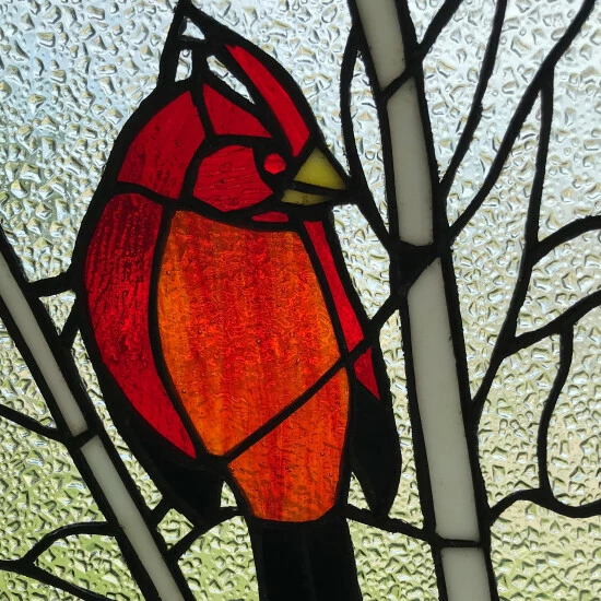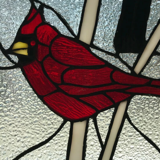 Express artistic vibes in your home with this Northern Cardinal Songbird stained glass window panel. Crafted with water droplet real stained glass, this panel changes color on light exposure, offering a beautiful accent piece for your living room or kitchen window area. The decorative hanging chain ensures a stress-free installation.